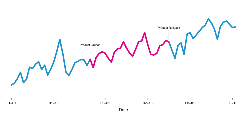 By simply looking at that curve you can mistakenly assume this was a good launch, since the metric goes up afterwards. However, external changes often have more impact than a product change, and through a proper A/B experiment Airbnb found this was neutral and rolled it back. Interestingly enough, later they rolled back the roll back because even though the experiment was not positive, they thought it would be worth the cost to accommodate the use case, a pure product decision, not backed by data, but made safe by data.