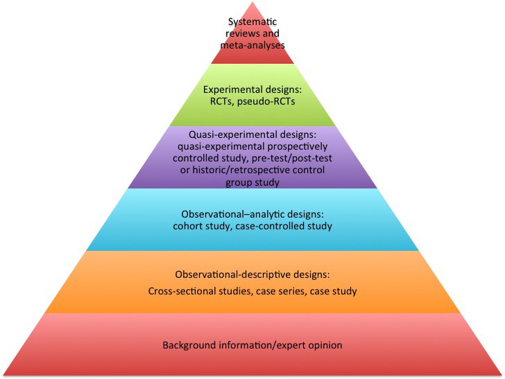 The Hierarchy of Evidence is a well established classification of knowledge gathering mechanisms which bring different levels of assertiveness to the decision making process. As you go up in the pyramid, the cost of generating data increases, as does the confidence in the information. As you go down, the easier it is to generate input for your discussion, but the less likely the input will be a true predictor of the effects of a change.